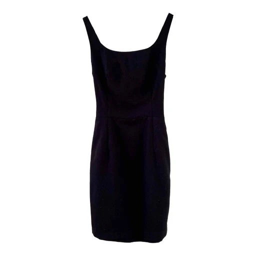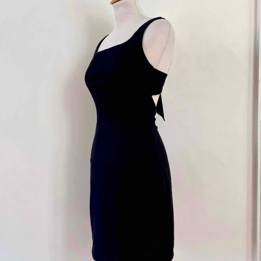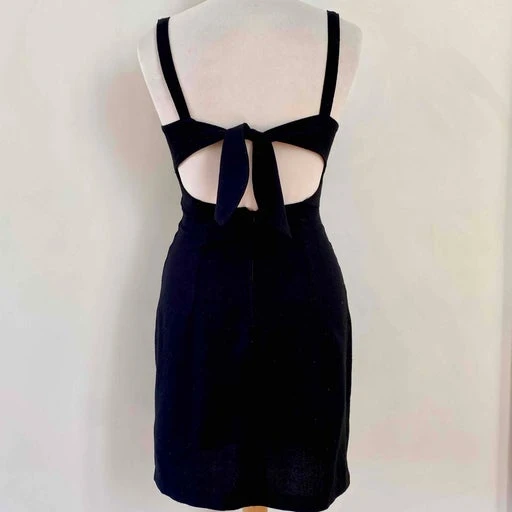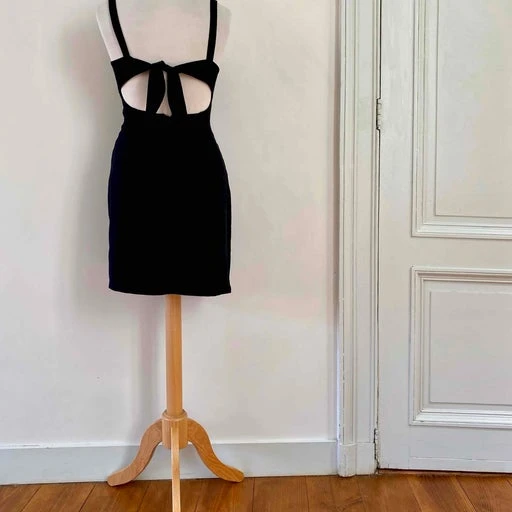 Mini robe dos nu, en crêpe viscose mélangé noire, dos à nouer par un joli noeud, fabriquée en France, taille 34 actuelle portée ici sur un mannequin T36, aisselles 42cm.