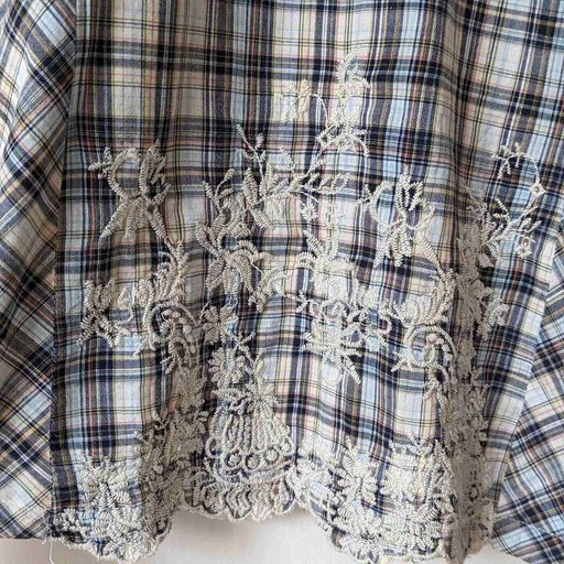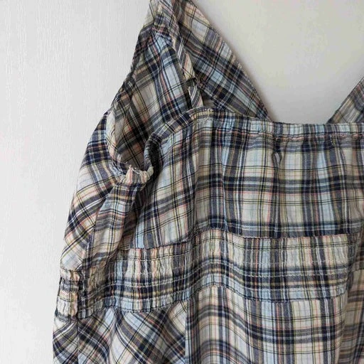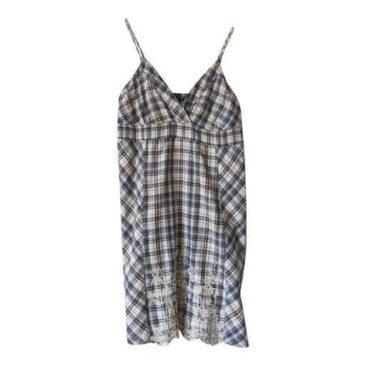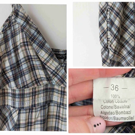 Mini robe en coton à carreaux agrémentée de fils dorés. Bretelles réglables. Joli détail de la broderie sur le devant . 2 poches. Forme évasée.