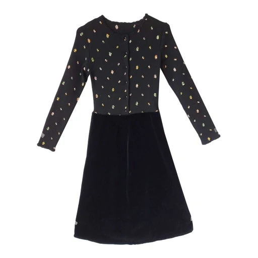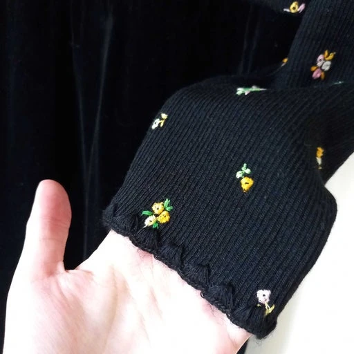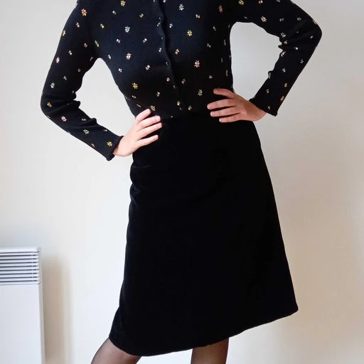 Robe des années 70, le bas est en velours noir et le haut extensible est brodé de fleurs minuscules.