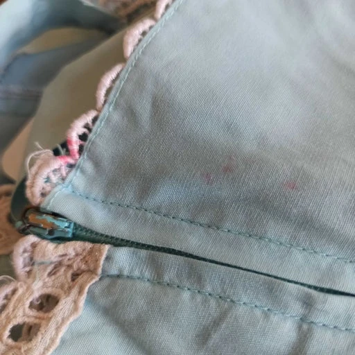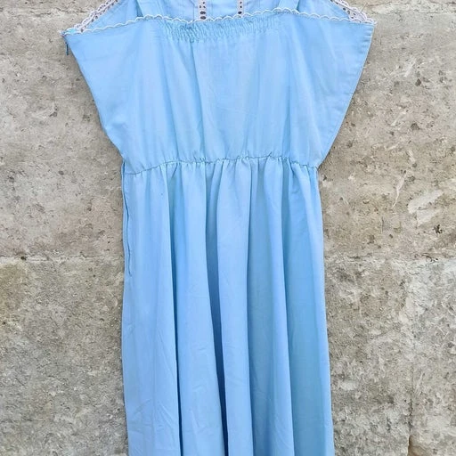 Robe midi en coton, à bretelles, buste surpiqué bordé de dentelle, décor boutons rond , fermée sous le bras avec une fermeture éclaire, élastique à la taille, bordée de ruban et dentelle dans le bas de la jupe ,coton.