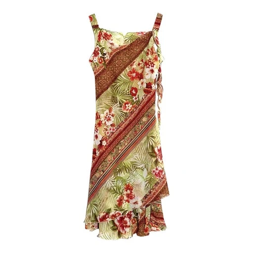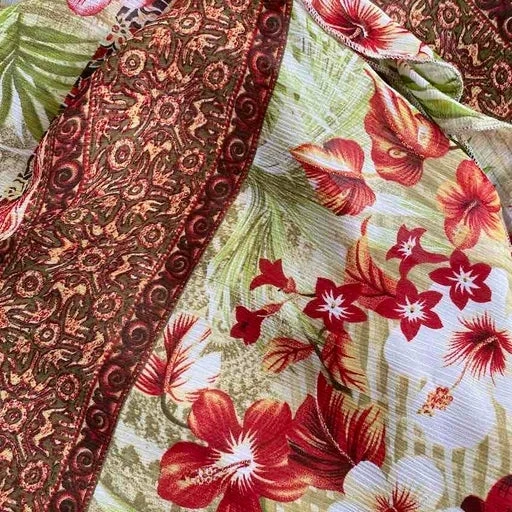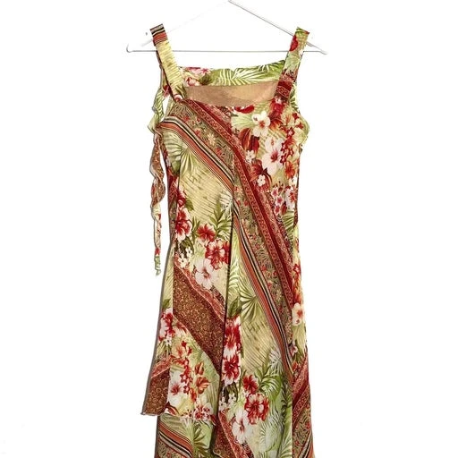Robe midi estivale 80’s. Bretelles de largeur moyenne, col bénitier, coupe ajustée et cintrée à la taille. Détail lien sur l’une des bretelles, à porter lâche ou à nouer. Composée de deux voiles vaporeux superposés (doublés), découpe asymétrique au bas, à motifs fleurs tropicales, avec pointes de paillettes. Made in France.