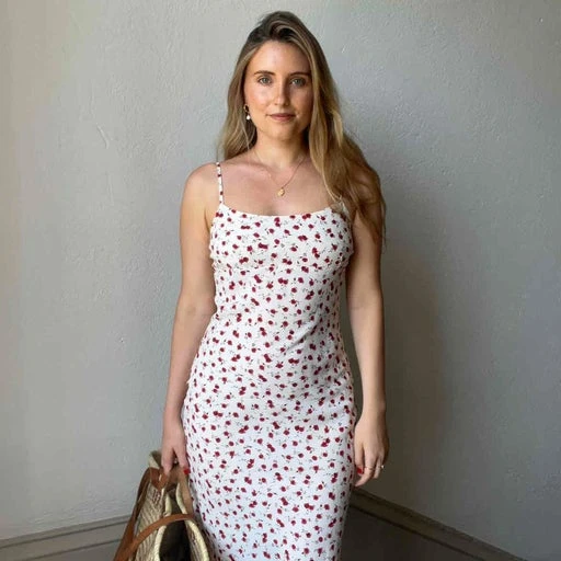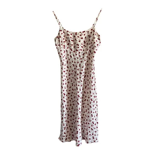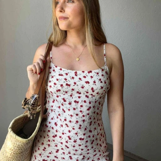 Robe à fleur écru. Robe couleur écru à fleur rouge. 100% coton. Longueur midi. Période des années 90. À porter avec un panier et une paire d’espadrille. C’est la robe parfaite pour les soirs d’été.