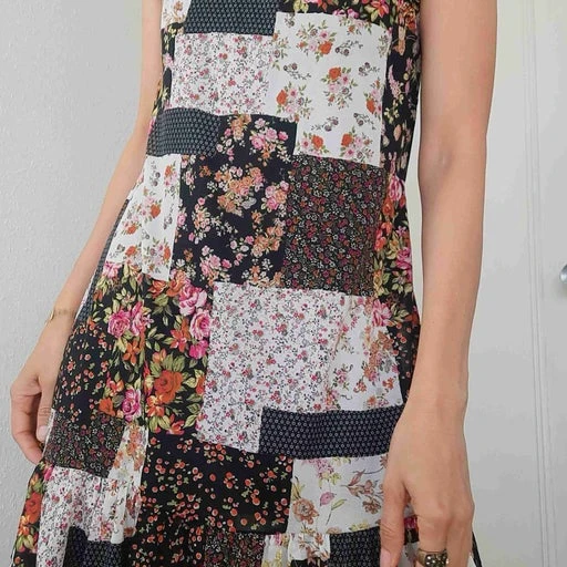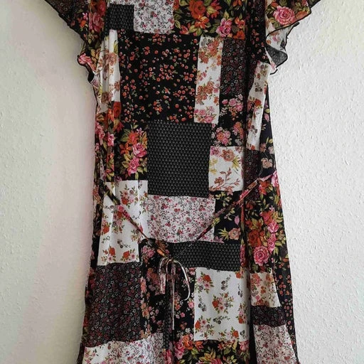 Robe mini à fleurs, style patchwork, entièrement doublée, épaulés et bas à volants, nouée à l’arrière pour marquer la ceinture, made in France. Modèle sur les photos taille 36.