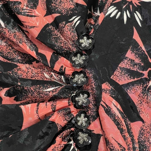 Pas de taille élastique, fermeture éclair sur le côté et des boutons fleurs composés de sequins noir et perles transparentes ornent le croisé.