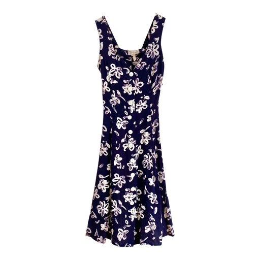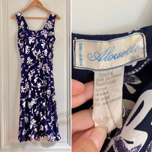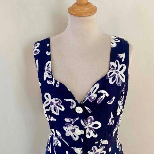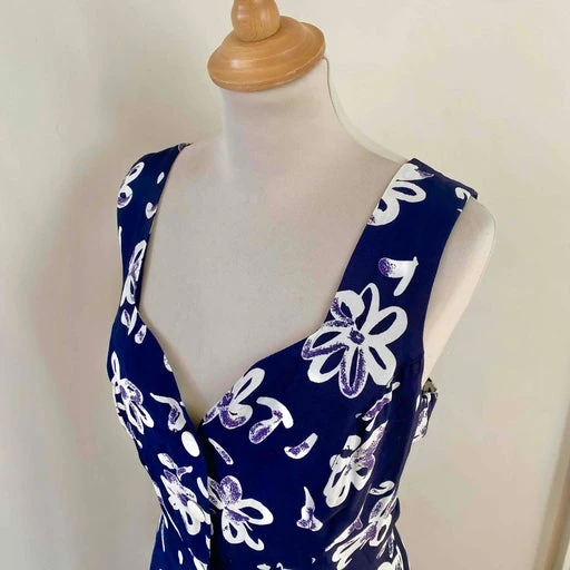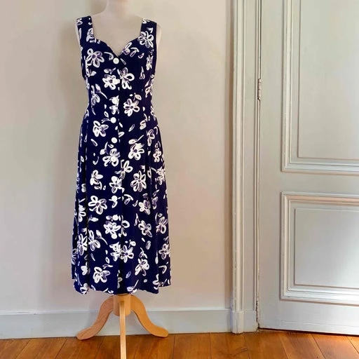 Robe boutonnée à fleurs, en viscose bleue nuit imprimée fleurs arty blanches et violettes, sans manches, boutonnée, taille dos à nouer, longueur midi, fabriquée en France, taille 36 et petit 38 portée ici sur un mannequin T36, aisselles 46cm.