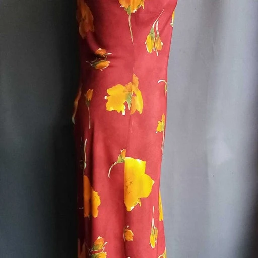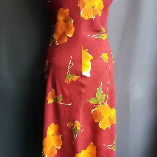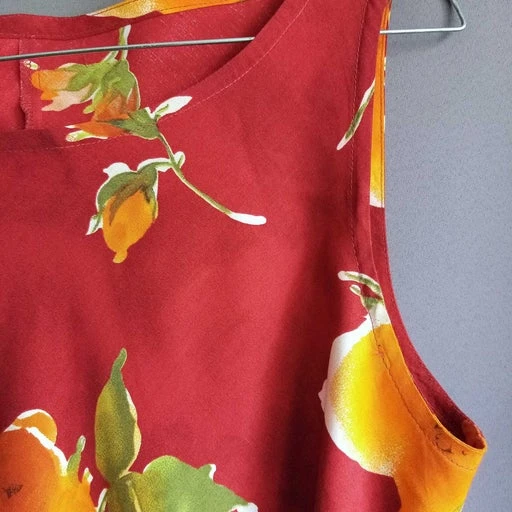 Robe longue, sans manche, rouge foncé imprimé fleurs.