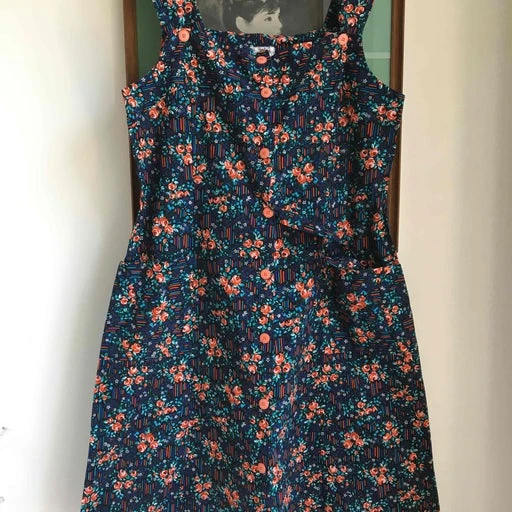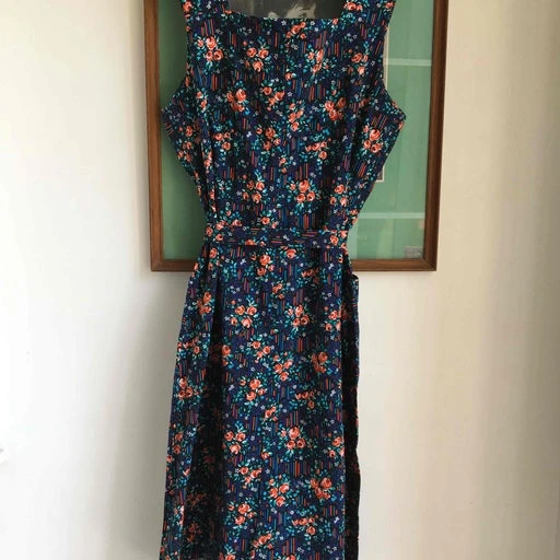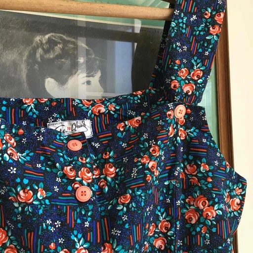 Robe à fleurs boutonnée en coton. Belle pièce vintage 70s début 80s création Gen Claud fabriquée en France. Coton d’antan souple et très résistant. Lien à nouer selon l’envie. Deux poches. Coupe robe tablier cintrée. Jolies couleurs chatoyantes. Longueur mi mollets. Mesure à plat sous bras 55cm. Neuve deadstock. Parfait état.
