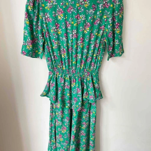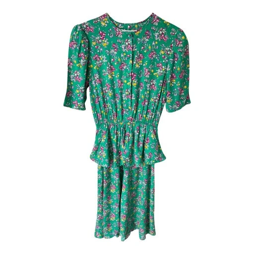 Robe midi à fleurs, verte, boutonnée sur le buste, fleurie et élastique au niveau de la taille. Made in UK.