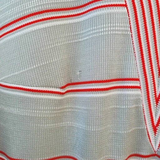 Robe à rayures, en maille, encolure en V, manches courtes, fermeture éclair dans le dos, doublée, ceinture assortie.