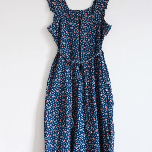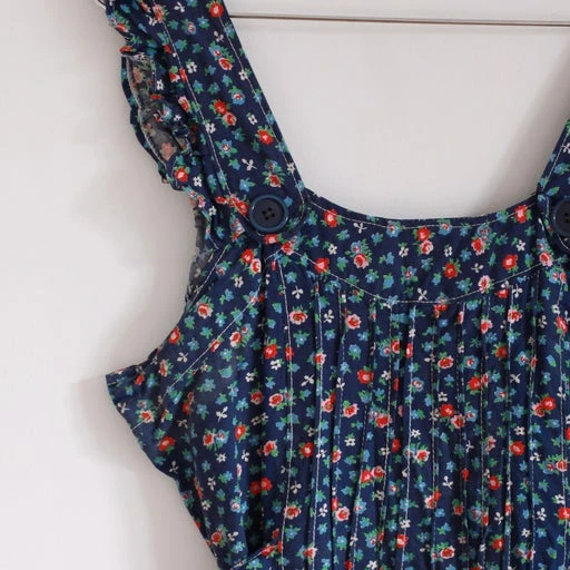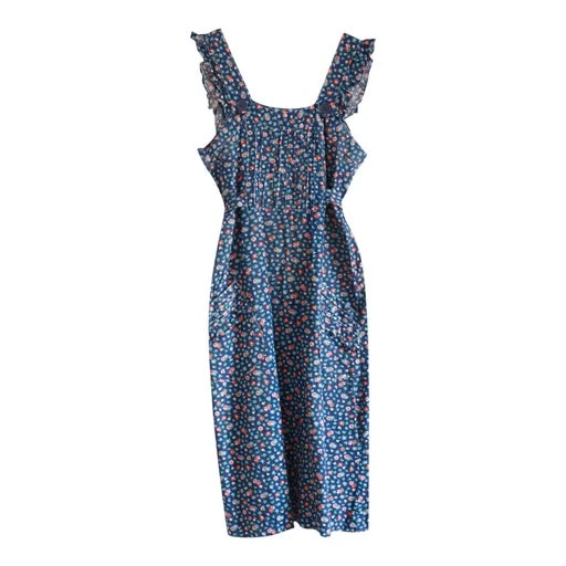Pièce phare des années 70’s de la marque Almiro Paris. Robe midi buste ajusté avec détails plissés, taille cintrée avec bande à nouer dos, bretelles épaisses à volants avec gros boutons ton sur ton devant – Matière fluide et agréable à porter 100% coton – Fermeture zip éclair – Grandes poches avec plissé et volant – Pièce estivale parfaite à porter avec des mules