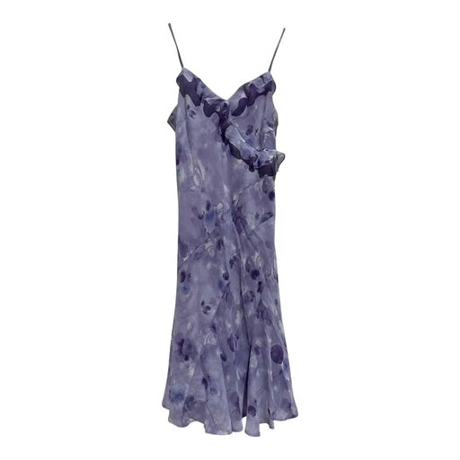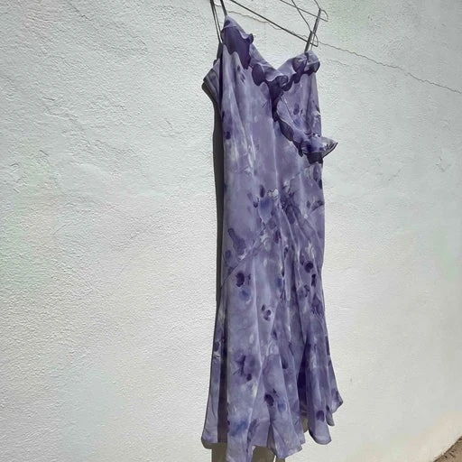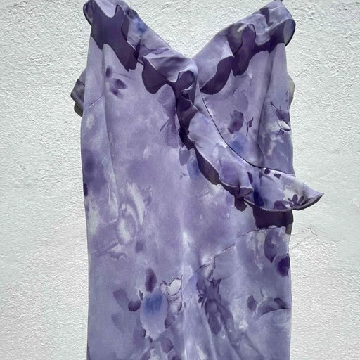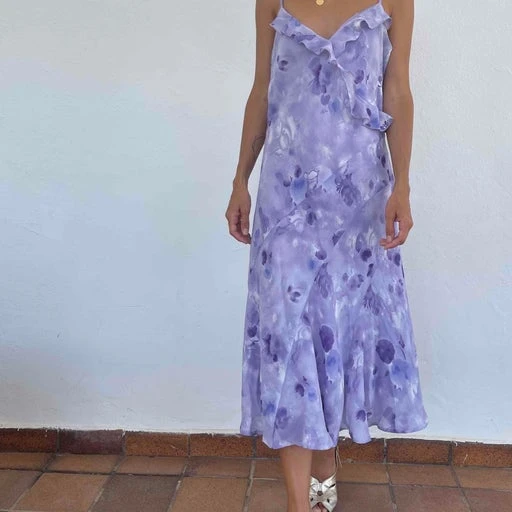 Robe midi à bretelles et volants lila, aux motifs abstrait / à fleurs. Fabriquée en France. Une coupe actuelle, tendance.