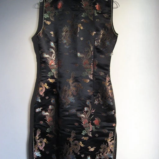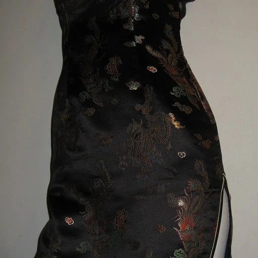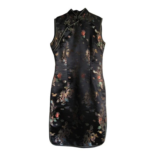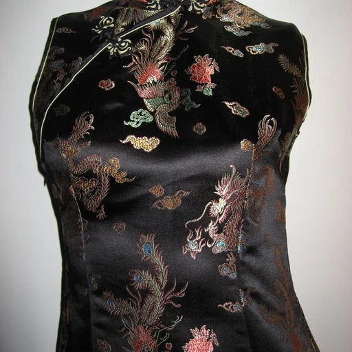 Imprimé dragons colorés et dorés sur fond noir, rendu lumineux.