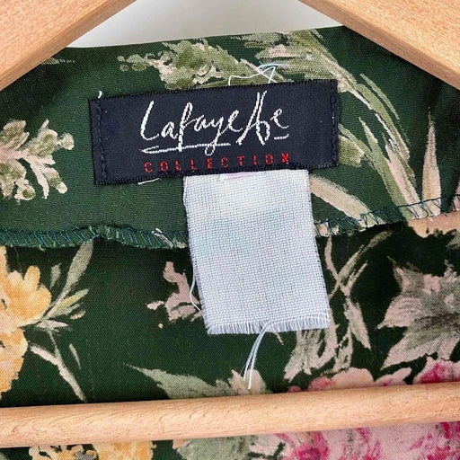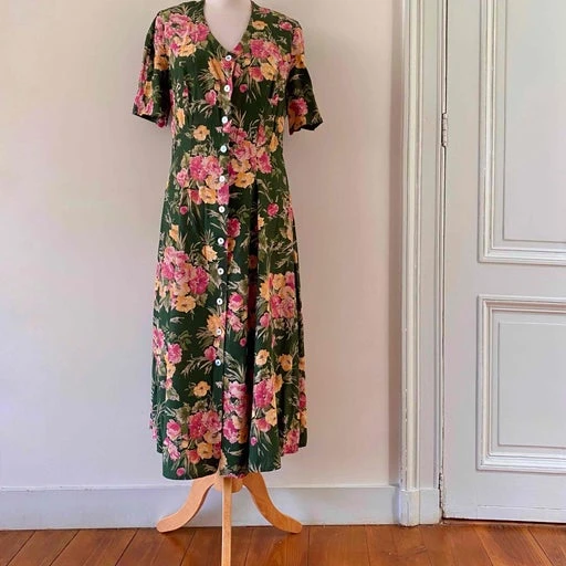 Robe longue à fleurs en viscose vert bouteille imprimée fleurs roses et jaunes, boutons nacres tout du long, taille cintrée, fabriquée en France, taille 36 portée ici sur un mannequin T36, aisselles 45cm.