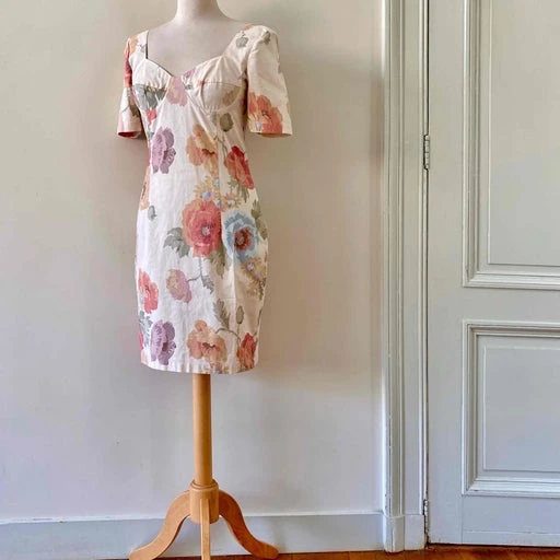 Robe Cacharel en 100% coton imprimée fleurs de coquelicots écrues beiges pastel roses, bleues, beiges, encolure corsage et découpes poitrine corbeille, à baleines souples , manches courtes, fabriquée en France, taille 34 actuelle et petit 36, portée ici sur un mannequin T36, aisselles 41cm / hanches 44cm.
