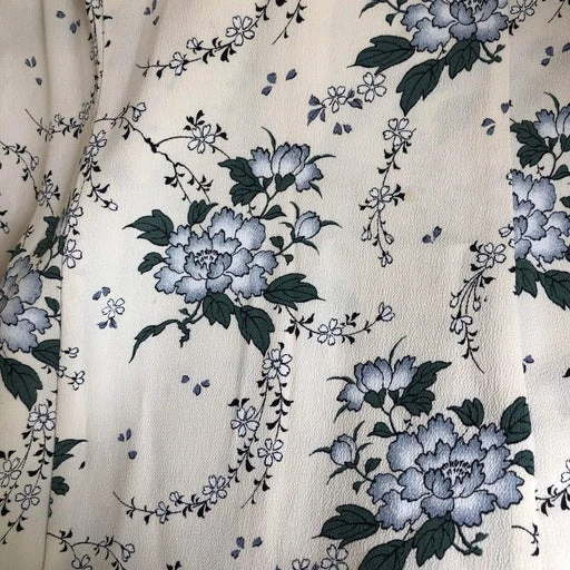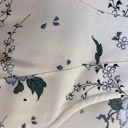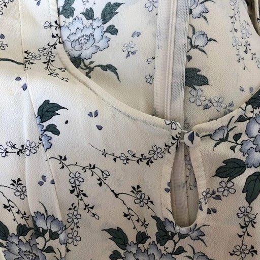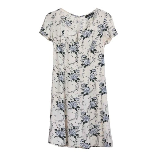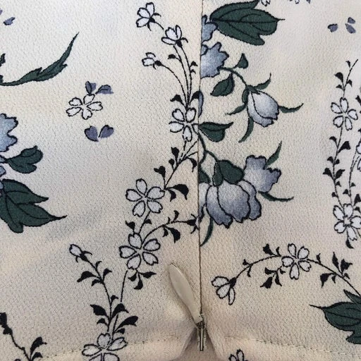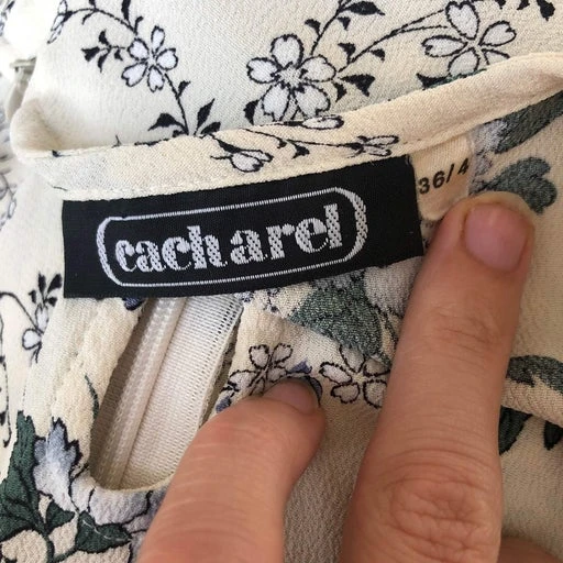 Robe Cacharel à fleurs bleues sur fond blanc, en viscose. Fabriquée en France. Se ferme avec un bouton sur le devant et une fermeture éclair derrière.