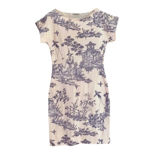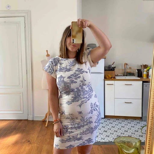 Robe t-shirt Cacharel en coton elasthanne écru imprimé toile de jouy bleue faïence, manches courtes crantées, fabriquée en Italie, taille 38/40 portée ici sur un mannequin T36 et une personne T40, aisselles 43cm / hanches 46cm.