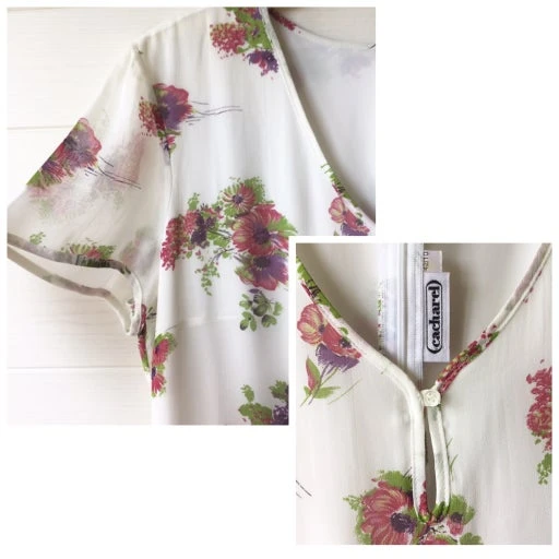 Robe fluide Cacharel écrue à fleurs, entièrement doublée, petites manchettes.