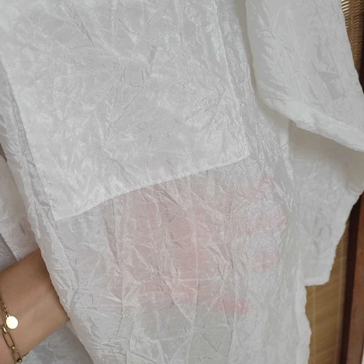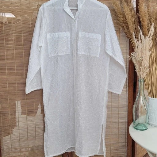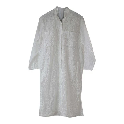 Robe chemise blanche lĂ©gèrement transparente en synthĂ©tique. Taille : unique – Convient du 34 au 42.