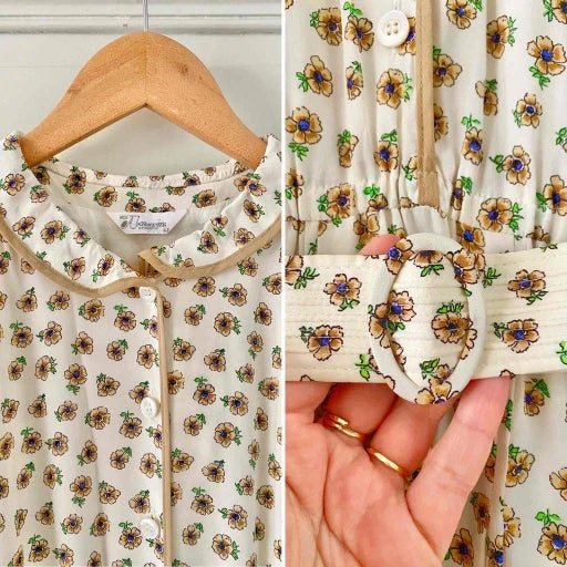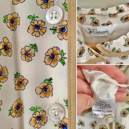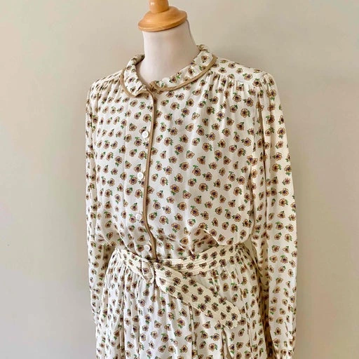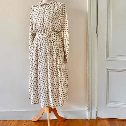 Robe chemise en soie fleurie, blanche imprimée petites fleurs beiges, bleues et vertes, col claudine, bordures camel, manches longues, bas plissé, ceinture taille plissée à boucle ronde, taille élastique, fabriquée en West Germany, taille 38 portée ici sur un mannequin T36.