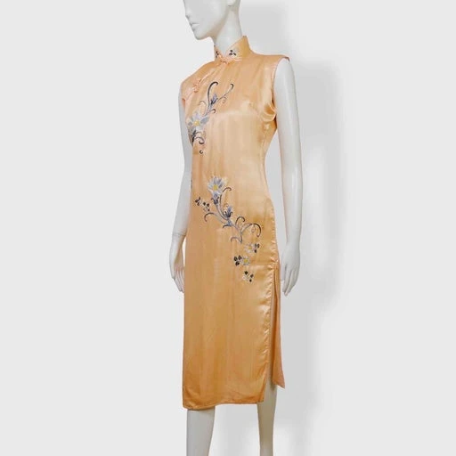 Robe chinoise quipao longue en soie orange clair, brodée d’un délicat motif floral dans les tons bleu et gris. La robe est fendue en bas sur les deux côtés. Elle se ferme via une fermeture éclair latérale et par des boutons en tissus sur le col. La robe est entièrement doublée. 100% soie. Fabriquée à Hong Kong dans les années 80s. Parfaite pour une taille M.
