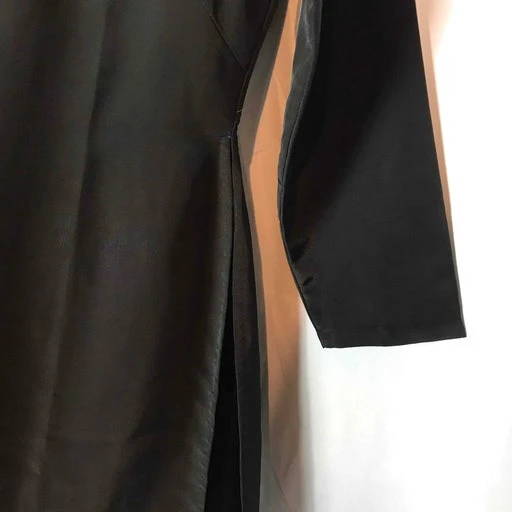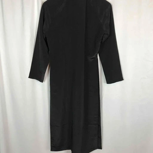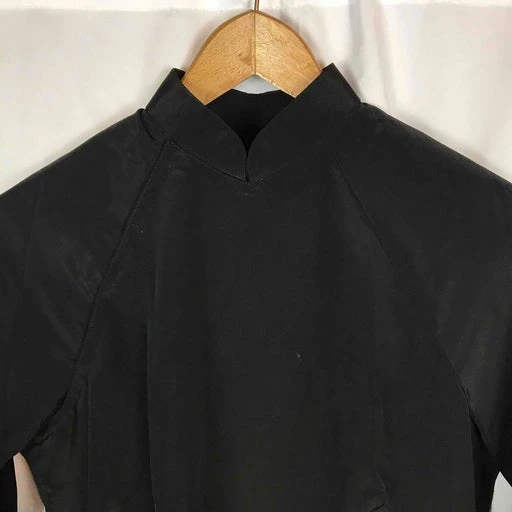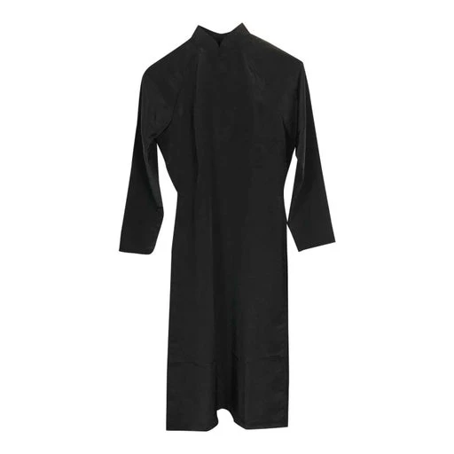 Robe chinoise noire fluide, col montant, fendue sur les côtés, boutons pression sur le col et le long du côté droit.