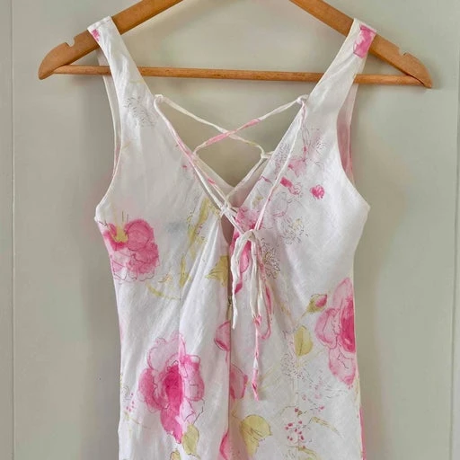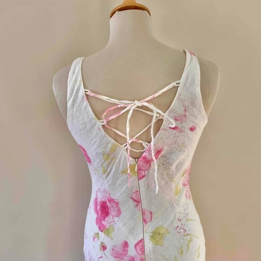 Robe dos nu en lin blanc doublé imprimée fleurs roses fuchsias et vertes, dos nu lacets à nouer, fermeture éclaire, longue et forme fit and flare, fabriquée en France, taille 34 et 36 portée ici sur un mannequin T36, aisselles 43cm.