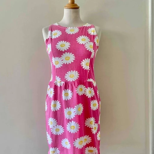 Robe t-shirt à fleurs, en jersey de coton élasthanne rose fuschia imprimée marguerites blanches et jaunes, emmanchures américaines, alain manoukian, Années 90’s, fabriquée en France, taille 36 portée ici sur un mannequin T36, aisselles 44cm.