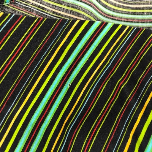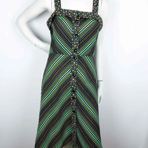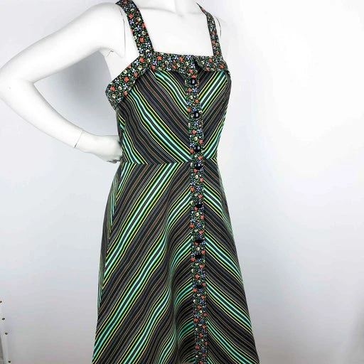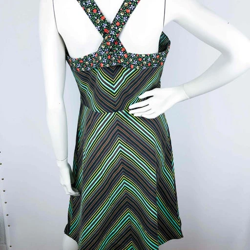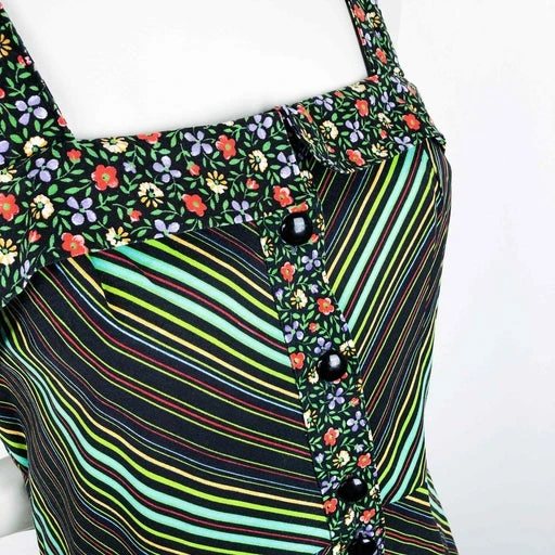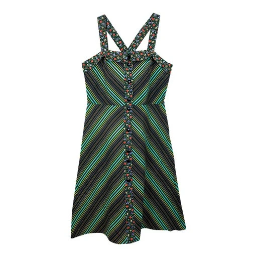 Robe à rayures et bretelles à fleurs en coton. Boutonnée sur le devant, bretelles croisées à l’arrière, col carré.