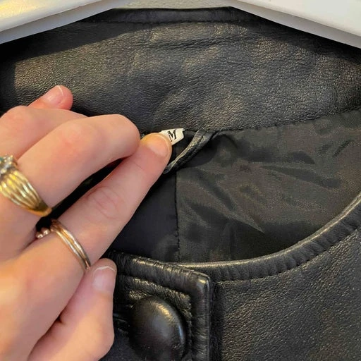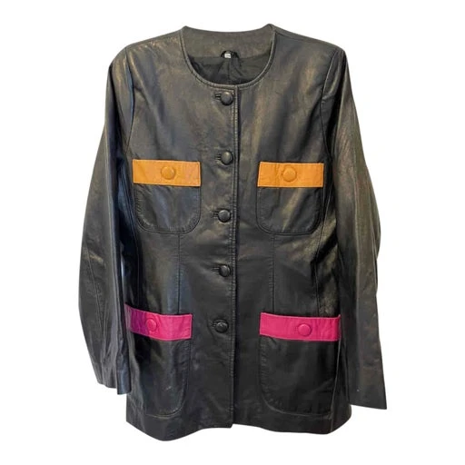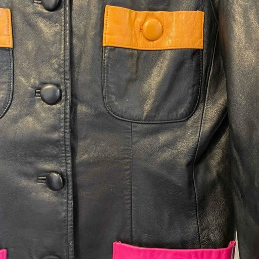 Veste longue en cuir des années 80. Gros boutons et poches colorées avec des couleurs très pop. Elle est mi longue et indiquée taille M à l’étiquette. Je la porte ici cintrée en faisant du 34. Pourra donc convenir à 34,36,38 aisément. Elle a des épaulettes. Couture. Épaules à épaules 40 cm, poitrine Aisselles à aisselles 48 cm, longueur 74 cm et longueur manche 60 cm.