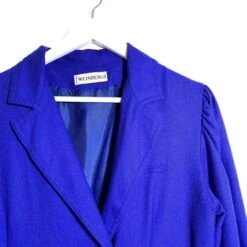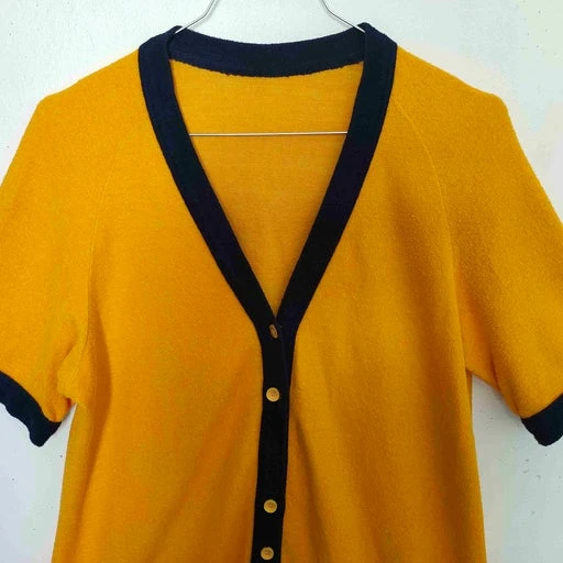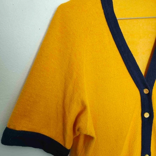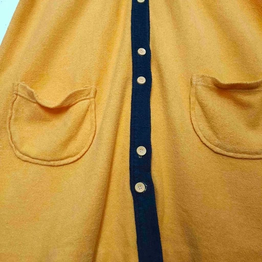 Robe en éponge couleur jaune safran. Bordée de maille bleu foncé. Fermée tout du long sur le devant par des boutons assortis. Coupe trapèze. Col à V, profond. Manches courtes. Deux petites poches sur le devant. Made in Italy.