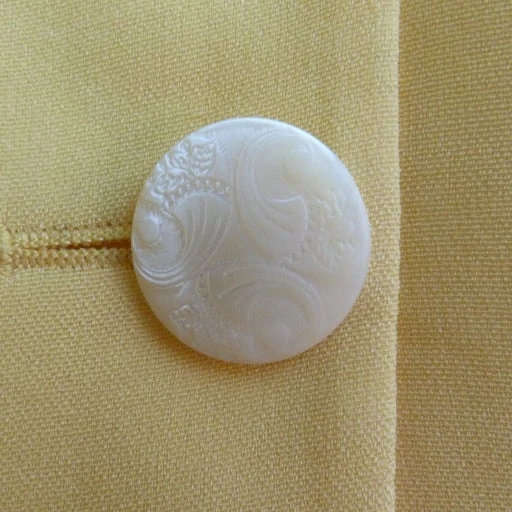 Fermeture par boutons effet nacré gravé fleuri (un bouton de rechange à l’intérieur).