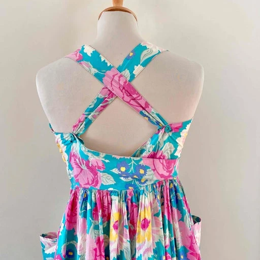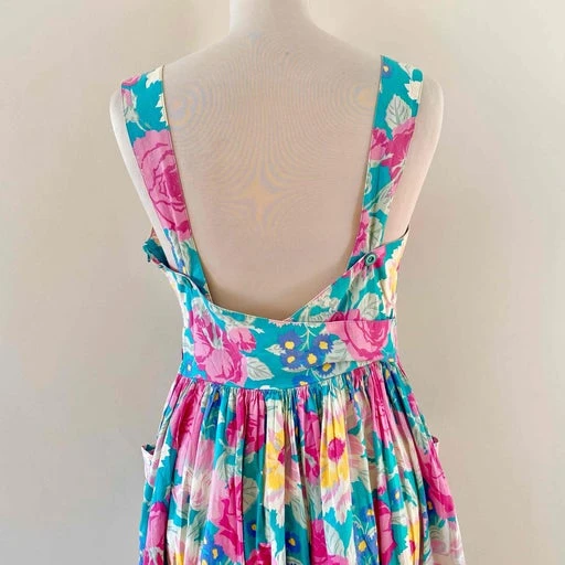 Robe Laura Ashley en 100% coton, dos nu, bretelles boutonnées à croiser, encolure corsage coeur, imprimée vert bleu canard à fleurs rose fuschia, jaunes, pastels.