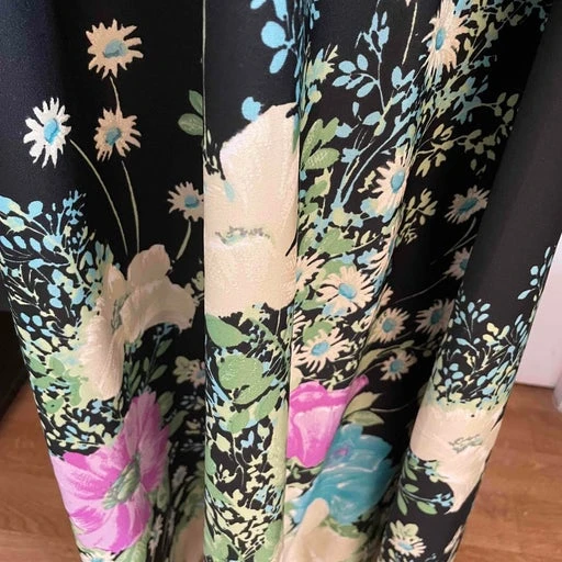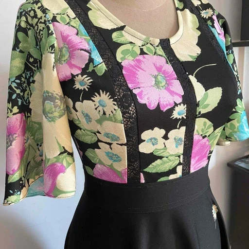 Robe 70’s, longue, noire à fleurs et manches mi-longues, avec dentelle sur poitrine et grand zip dans le dos.