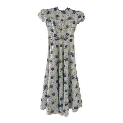 Robe longue fleurie, bohème romantique en voile de coton, tissu léger, fait maison. Fond blanc à motif floral bleu, jaune, vert, turquoise. Coupe cintrée, taille très haute, taille empire, fermeture zippée dans le dos. Manches ballons. Bas de robe évasé doublé, rappel dentelle et galon sur le col et plastron. Taille très haute.