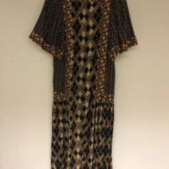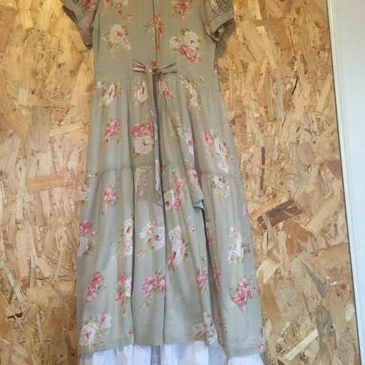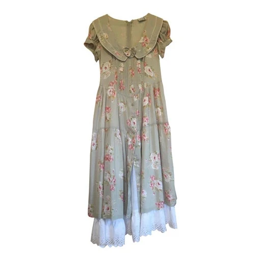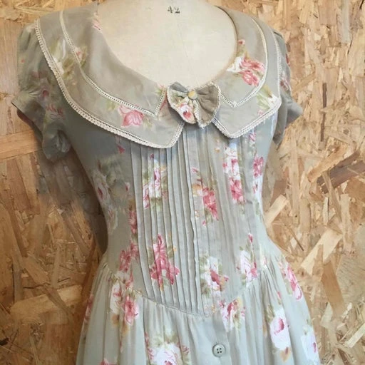 Robe à grand col, imprimée de fleurs bohème. Détails : manches ballon, grand col, volants et jupon blanc, taille resserrée par deux liens à nouer au dos. Fermeture éclair au dos.