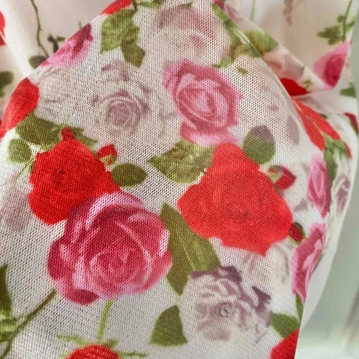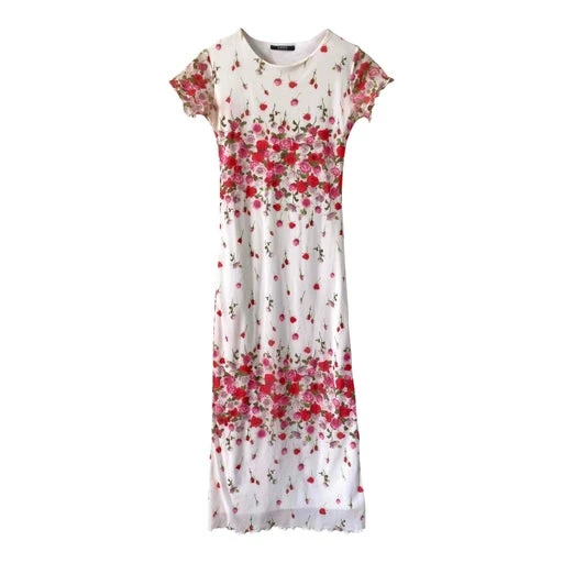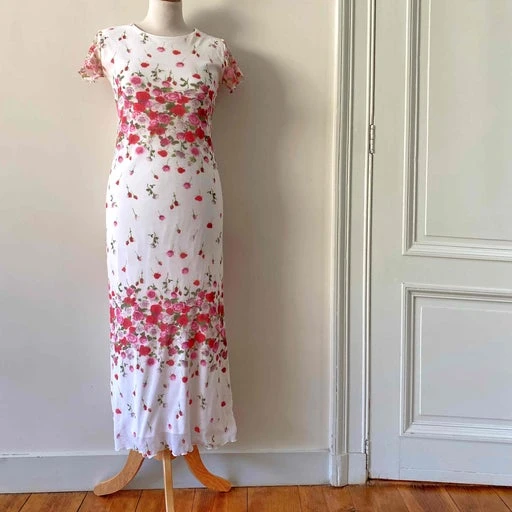 Robe longue à fleurs, en maille mesh résille polyamide blanche imprimée bouquets de fleurs roses, fuschias et vertes, forme robe t-shirt, bords finitions vaguelettes, fabriquée en France, taille 36 portée ici sur un mannequin T36, aisselles 43cm.