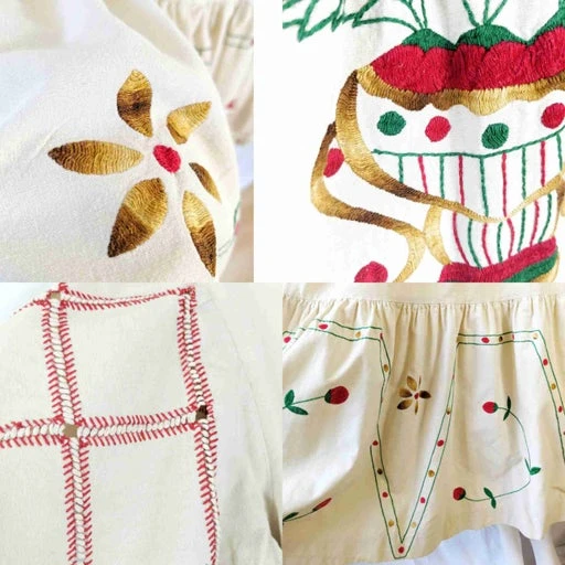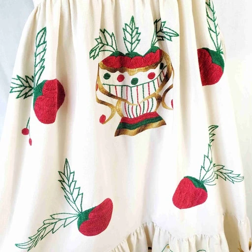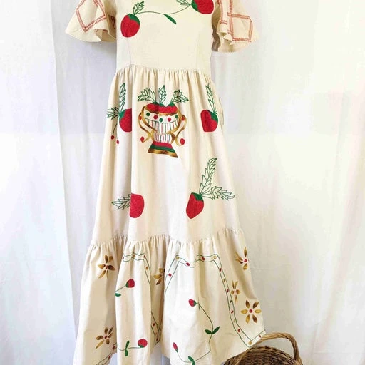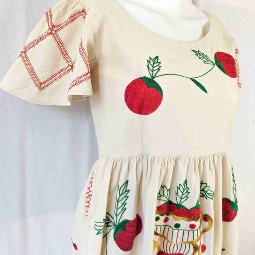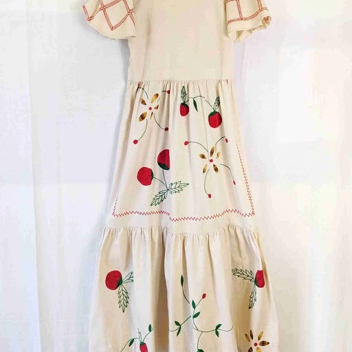 Robe longue brodée main, années 1970. En toile ancienne beige avec broderie de fleurs multicolores devant et dos. Manches courtes volantées avec broderie ajourée. Volant brodé au bas. Le buste est étroit, convient pour une petite taille : largeur aisselles 40 cm. Zippée sur le côté. Une pièce unique entièrement faite à la main.