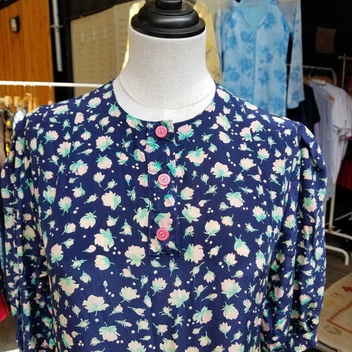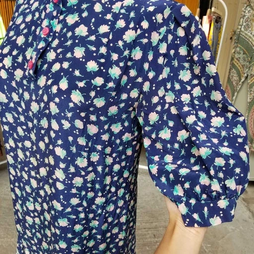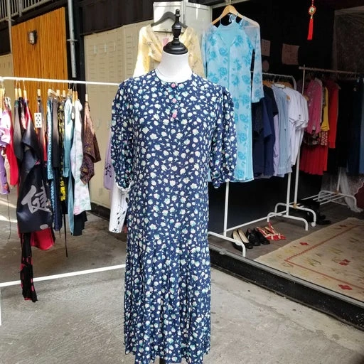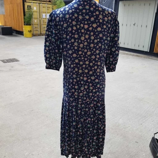 Robe longue en soie, coupe légèrement charleston avec plissé au niveau des genoux. Elle possède des manches bouffantes et un joli col rond. Convient à une taille 36 à 38 (petite poitrine).