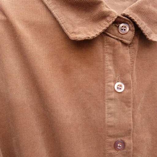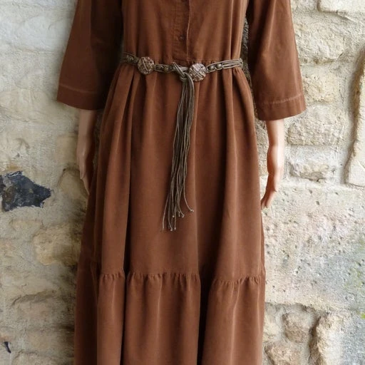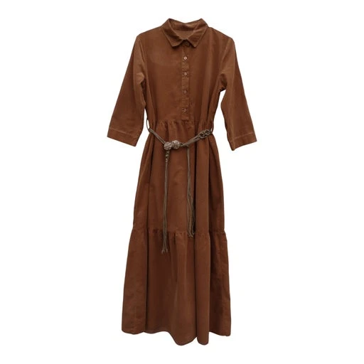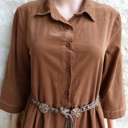 Robe longue en velours, coupe ample, couleur marron, 100% coton, velours côtelé fin et léger, ceinture cordons, perles bois et noix de coco, fermeture par boutonnage niveau poitrine, bas avec volants.