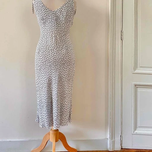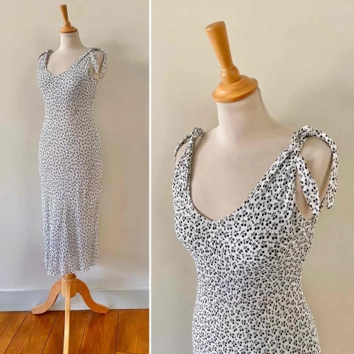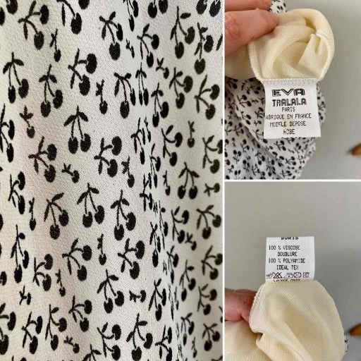 Robe midi cerises, en voile viscose doublée blanche imprimée petites cerises noires, bretelles à nouer, forme fit and flare en biais, fabriquée en France, taille 36 portée ici sur un mannequin T36.