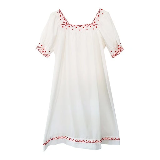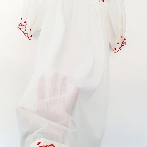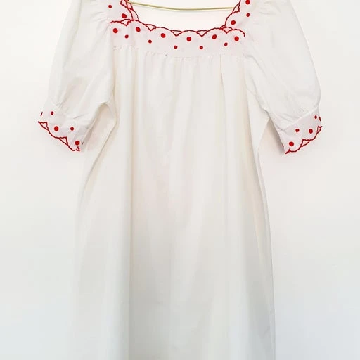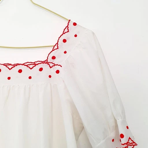 Jolie robe ou blouse 70’s. Encolure carrée, broderies au col, manches et bas de la robe.