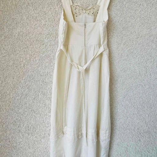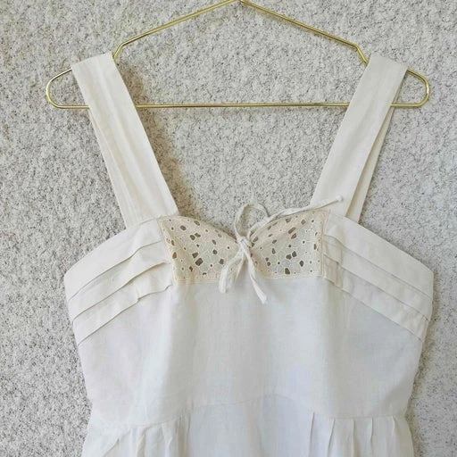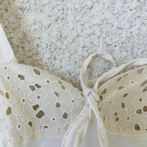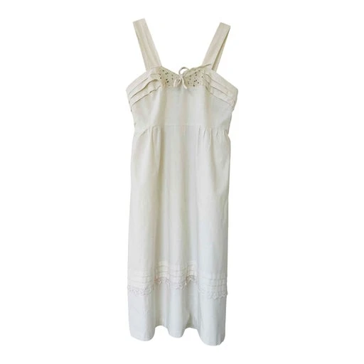 Robe midi 60’s en coton épais. Empiècement broderie et drapée à la poitrine. Large bretelles. Lien au dos pour cintrer la taille.