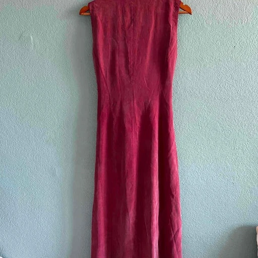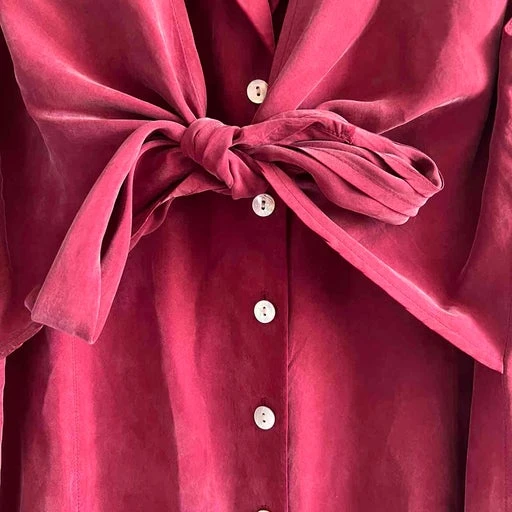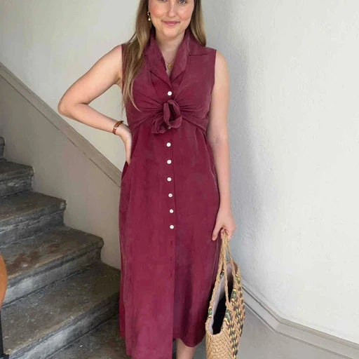 Robe midi en soie. Robe longueur midi couleur rouge/Bordeaux. 100% soie. Taille 38. Effet sur le haut pour resserrer à la taille avec des liens. Boutons en nacre sur le devant de la robe, qui peuvent laisser apparaître les jambes.