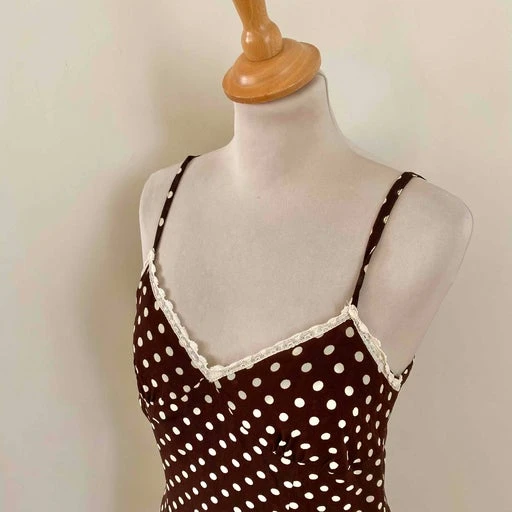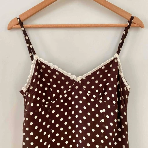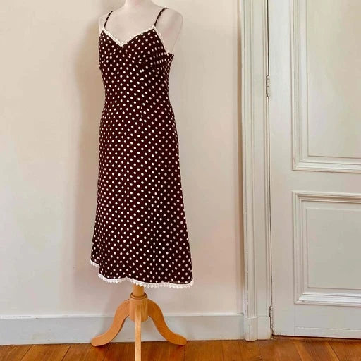 Robe nuisette à pois, en voile viscose chocolat imprimée pois blancs, bordures en dentelle écrue, bretelles spaghettis, forme fit and flare en biais, taille actuelle 36 portée ici sur un mannequin T36, aisselles 43cm.