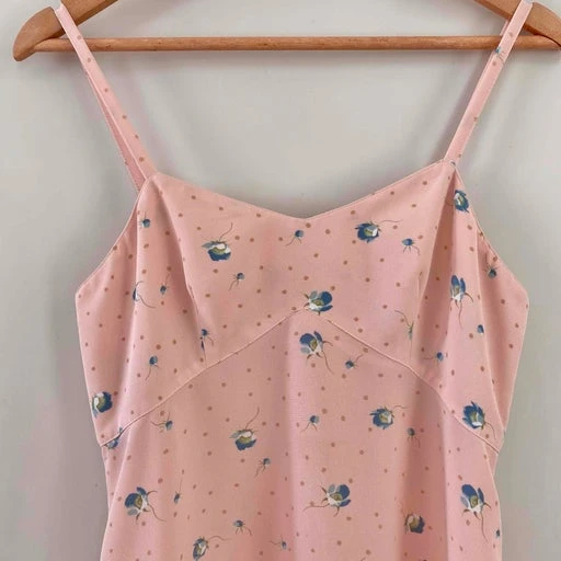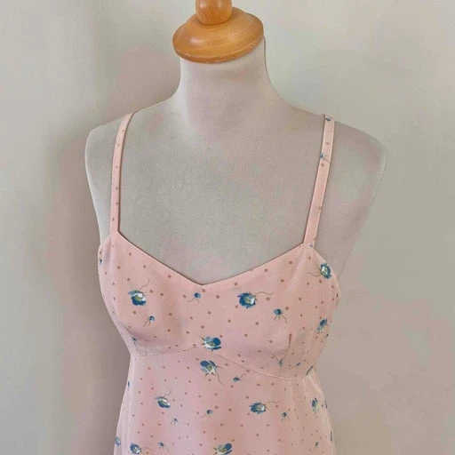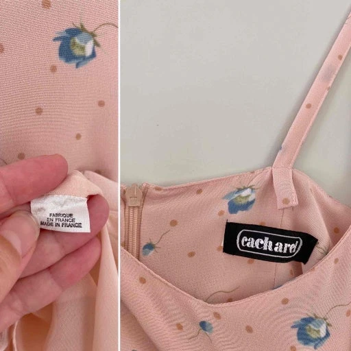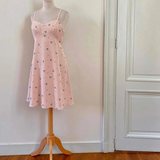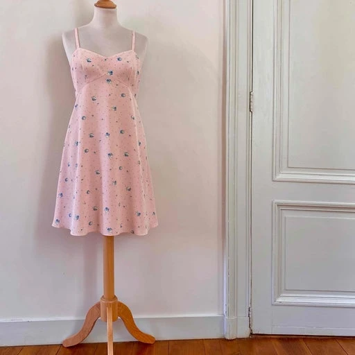 Robe nuisette Cacharel en viscose rose pastel imprimée pois roses poudré et petites fleurs bleues, bretelles spaghettis, découpes sous poitrine en V, bas évasée, fabriquée en France, taille 36 portée ici sur un mannequin T36, aisselles 43cm.