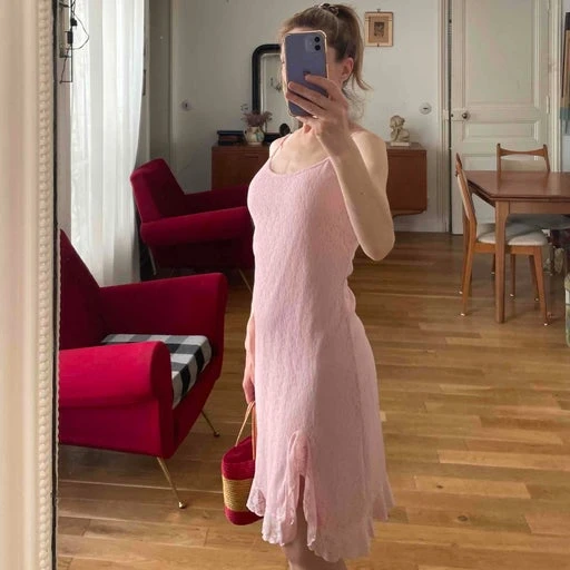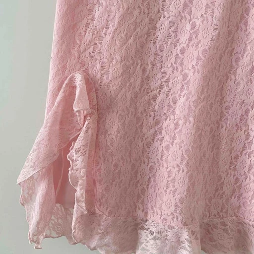 Robe nuisette en dentelle rose avec fleurs, type lingerie, nuisette. Fente et volant au bas, bretelles fines spaghettis non réglables. Encolure ronde à l’avant, carrée au dos. Non transparente.