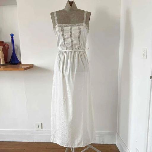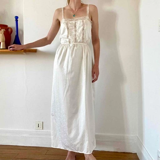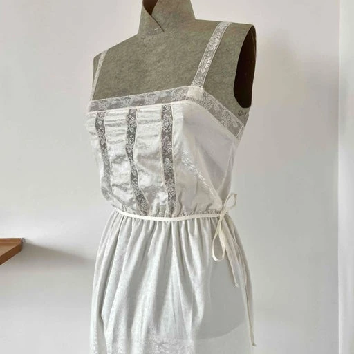 Robe romantique à dentelle. Coupe ajustée à la taille avec élastique et ceinture à nouer. Dentelle sur l’avant. Bretelles en dentelle. En jacquard à motif satinée en toi sur ton. Une pièce des années 80/90 inspirée des pièces de lingerie anciennes. Fabriquée en France.