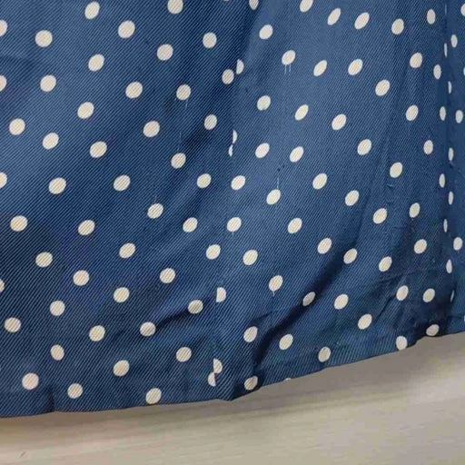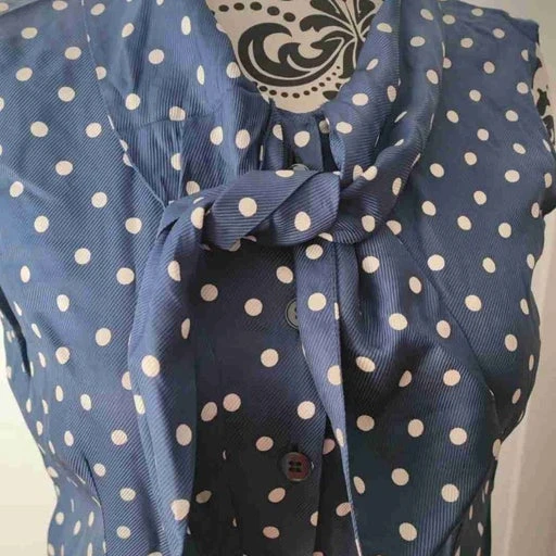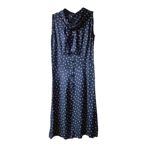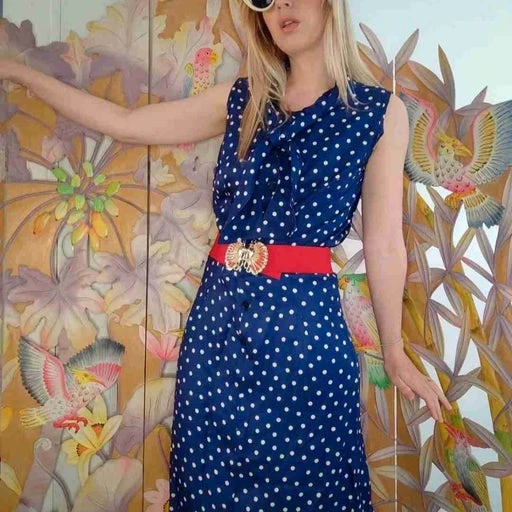 Robe midi en soie bleu et blanc à pois style pin-up marinière avec col lavallière pour l’accrocher en ruban. Boutons bleu le long de la robe et un bouton pression au niveau de la taille.