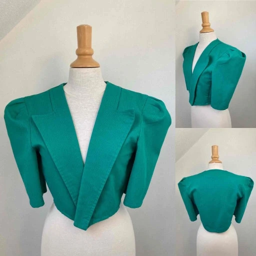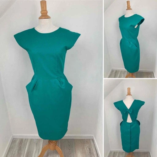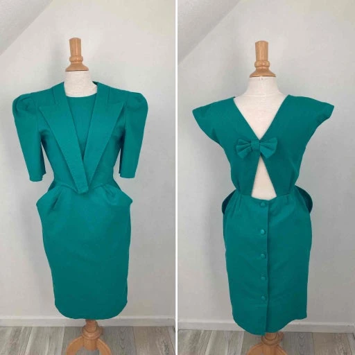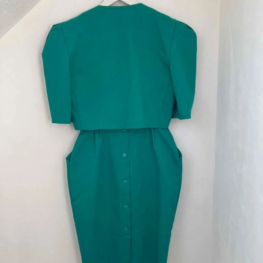 Ensemble robe dos nu et veste courte vert véronèse en coton côtelé.