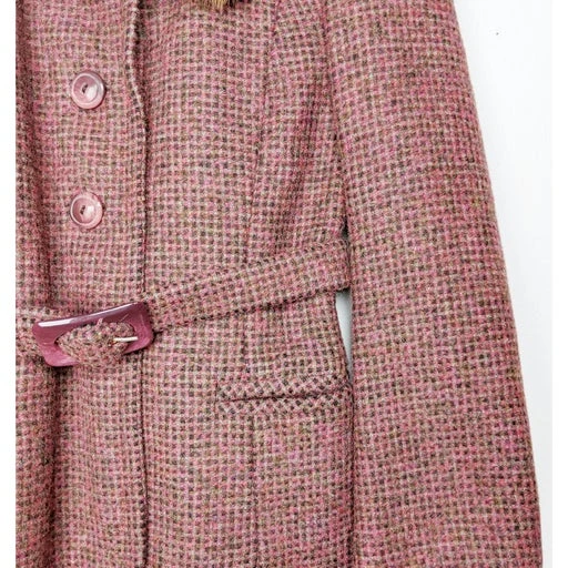 Veste avec grand col en fourrure. Manches longues. Coupe cintrĂ©e. Ceinture assortie, avec boucle rectangulaire pourpre en plastique et un passant. BoutonnĂ©e jusqu’Ă taille sur le. Un bouton intĂ©rieur avec une bride au niveau de la taille. Petit bouton supplĂ©mentaire en dessous du col. Deux poches passepoilĂ©es de chaque cĂ´tĂ©. Entièrement doublĂ©e. Lainage assez Ă©pais.